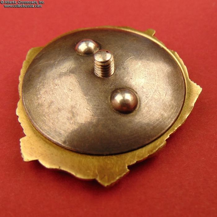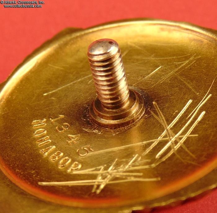The order was never converted to suspension and retains its original, full-size screw post measuring approx. 9 mm in length from its base (over 9 mm long measured from the reverse of the badge). The reverse has some deep scratches, obviously a result of an amateur testing for gold content (decades ago, when no information about the single piece, 18-K gold version of the Order of Lenin was available in published sources and the Internet was still in its infancy, the "pale" look of the metal may have caused some concern among the uninitiated!) The scratches however do not affect either the serial number or the mint mark. The order comes with a silver screw plate which is of a slightly later, WW2 era, but fits the screw perfectly.