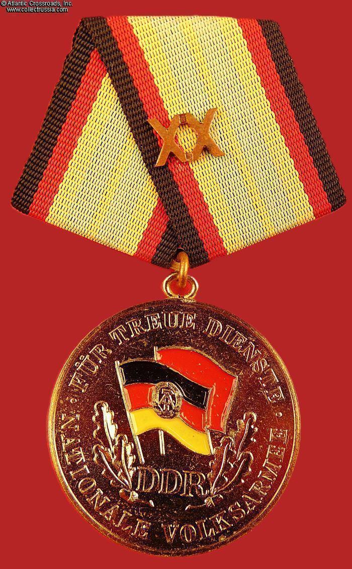 The medal (original name "Medaille für treue Dienste in der Nationalen Volksarmee") was instituted on 1 June 1956 in four grades: bronze for 5 years of service, silver for 10 years, gold for 15, and gold with colored flag and Roman numerals "XX" on the suspension and ribbon bar for 20 years of service. It was presented to members of the NVA and Stasi, as well as individuals who actively supported the NVA and Stasi.