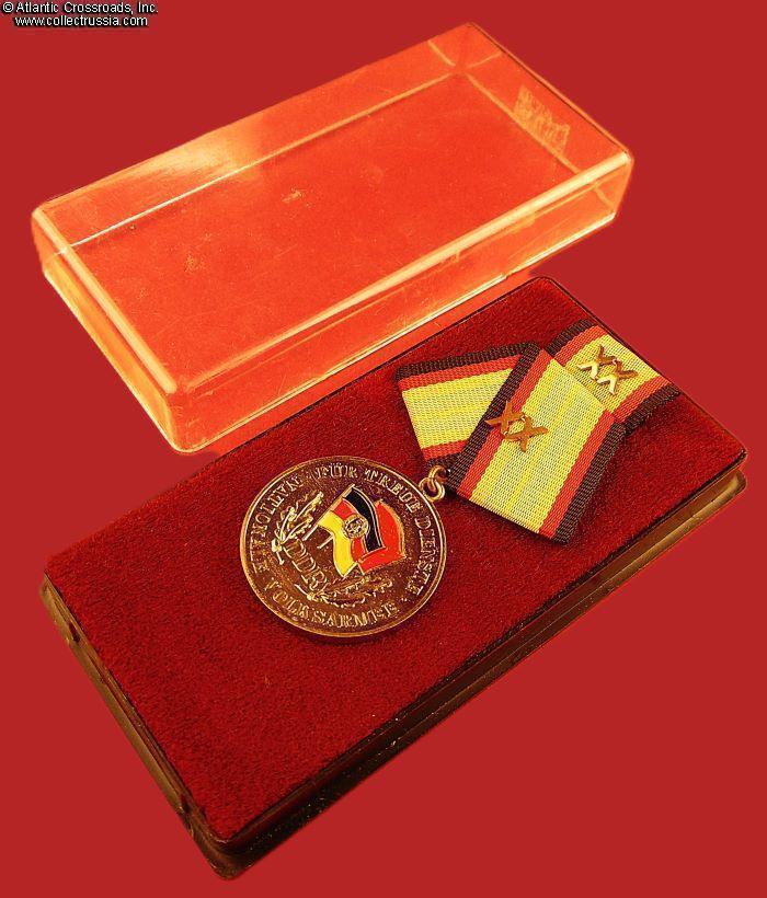 Brass gilt, enamels; the medallion measures 35.1 mm wide and weighs 19.5 g. The inscription encircling the obverse reads "For Faithful Service, DDR National People's Army". The inscription around the Est Germany state emblem on the reverse reads "For Protection of the Workers' and Peasants' Power." The original presentation box has black plastic bottom lined with light foam rubber inside, the lid is in Plexiglas.