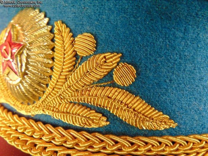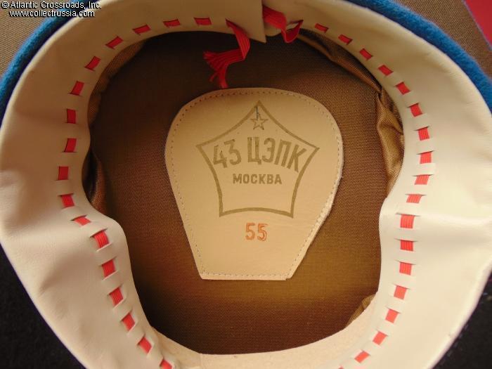 In olive drab wool gabardine with sky-blue band and piping. Gold embroidery around the hat badge and gold embroidered Air Force wings on the crown. Gold filigree chin cord. Features characteristically large "oversized" crown and patent leather visor with felt underside. Red silk tape threads through the leather sweatband to allow a customized fit, a feature unique to general officer hats. The two-piece hat badge is also the type specific to generals. The leather sweat shield shows the logo of the Moscow TsEPK Factory of the Ministry of Defense without the date of manufacture, as