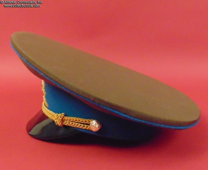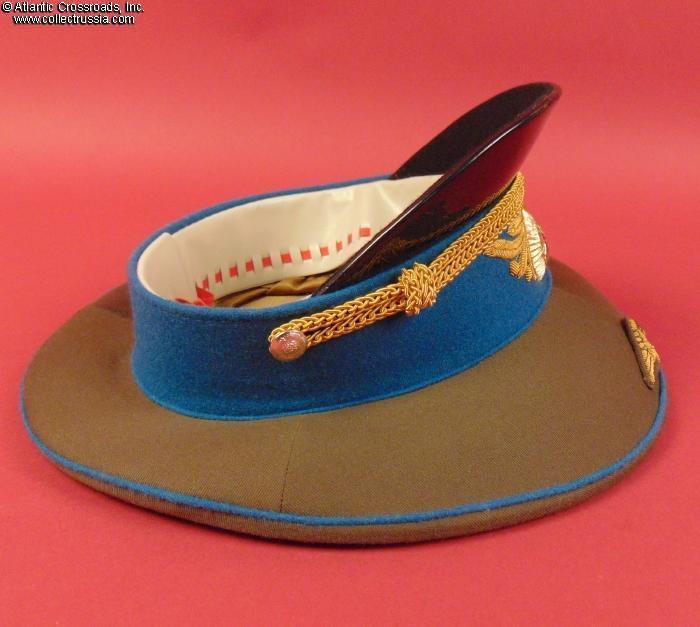 In olive drab wool gabardine with sky-blue band and piping. Gold embroidery around the hat badge and gold embroidered Air Force wings on the crown. Gold filigree chin cord. Features characteristically large "oversized" crown and patent leather visor with felt underside. Red silk tape threads through the leather sweatband to allow a customized fit, a feature unique to general officer hats. The two-piece hat badge is also the type specific to generals. The leather sweat shield shows the logo of the Moscow TsEPK Factory of the Ministry of Defense without the date of manufacture, as typical of the general officer hats produced after 1987. The label is marked 55 for size (Small, US size 6 7/8).