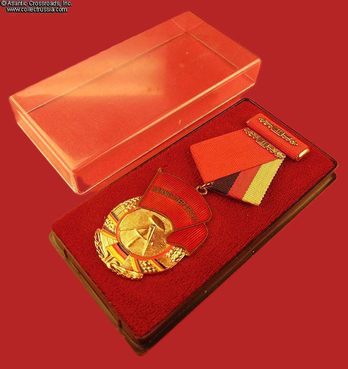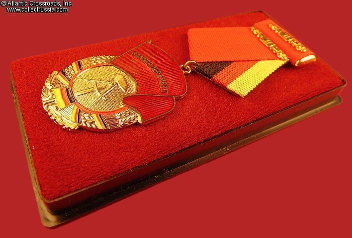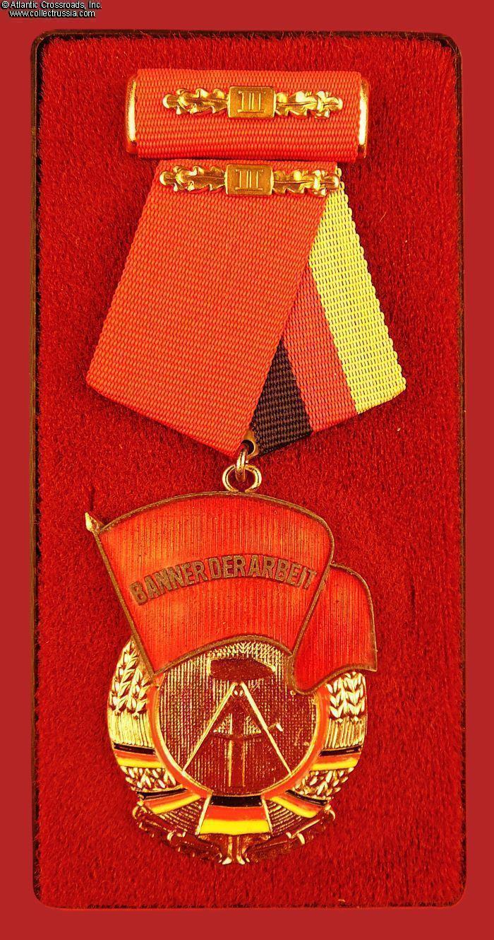 The Banner of Labor (original name "Banner der Arbeit") was instituted on 4 August 1954 in one class. On 8 August 1974, it was divided into three classes. The 1st class was the highest, and each class included a cash award. The order was awarded to individuals and collectives for excellent and long-standing service in strengthening the GDR, especially for outstanding achievements in national economy.
