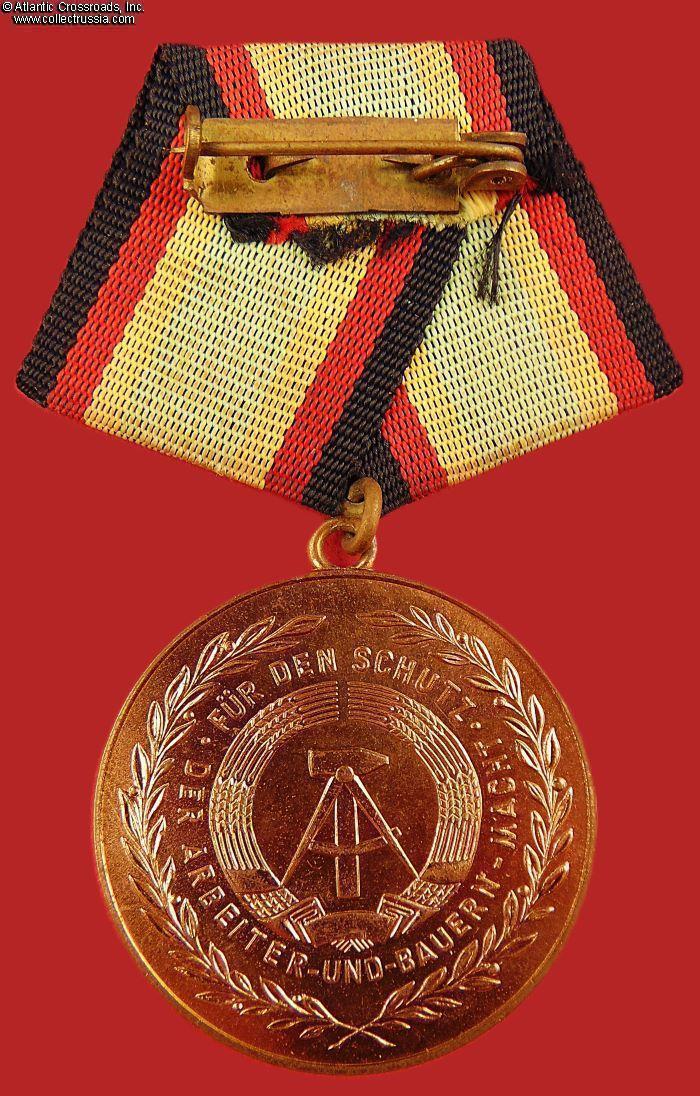 The medallion is in brass, measures 35.0 mm wide. The inscription encircling the obverse reads "For Faithful Service, DDR National People's Army". The inscription around the East Germany state emblem on the reverse reads "For Protection of the Workers' and Peasants' Power." The original presentation box has black plastic bottom lined with light foam rubber inside, the lid is in Plexiglas.