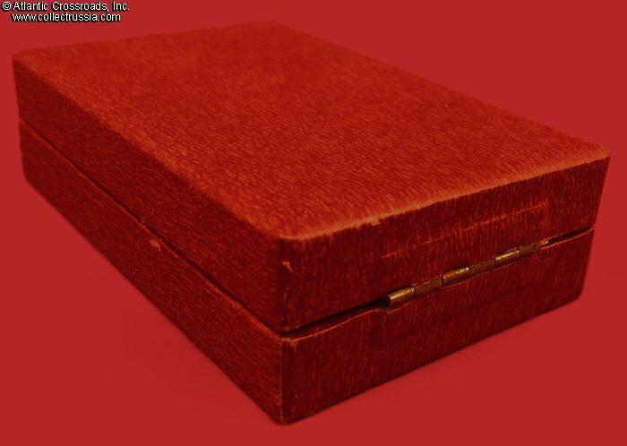 Silvered brass, enamels. The medallion measures 33 mm wide. The original fitted issue box is in light wood laminated with leatherette-textured paper and has a metal hinge. The fitted space is finished in red short-nap velvet. The lid is lined with light fabric.
