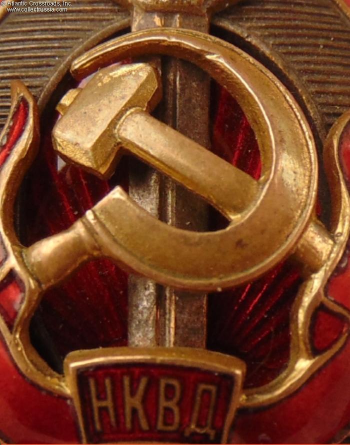 In very fine condition, outstanding for the highest NKVD award of WW2 vintage. The enamel on the red scroll is extremely well-preserved, completely free of the usual chips, flaking or repairs, and exhibits a beautiful luster. It has only some tiny hairlines in the upper left segment that caused a darker appearance in the area but apparently do not threaten the integrity of the enamel.