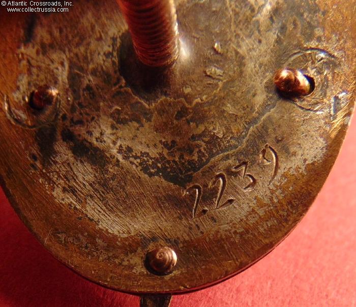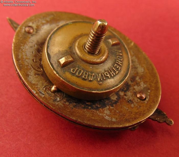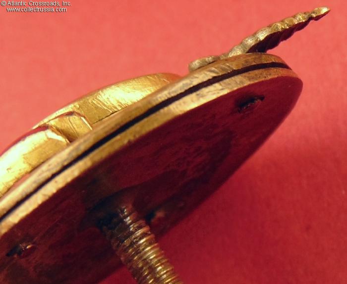 The wires holding parts of the badge are original, intact and tight; all parts align perfectly and show an equal amount of wear and patina. The screw post is original and measures approximately 13 mm in length?it has not been reduced. The badge comes with its original, characteristically thick screw plate with the mint logo, measuring 18.4 mm in diameter and weighing 4.0 g; as far as we know, this kind of screw plate is unique to the Distinguished NKVD Employee badge.