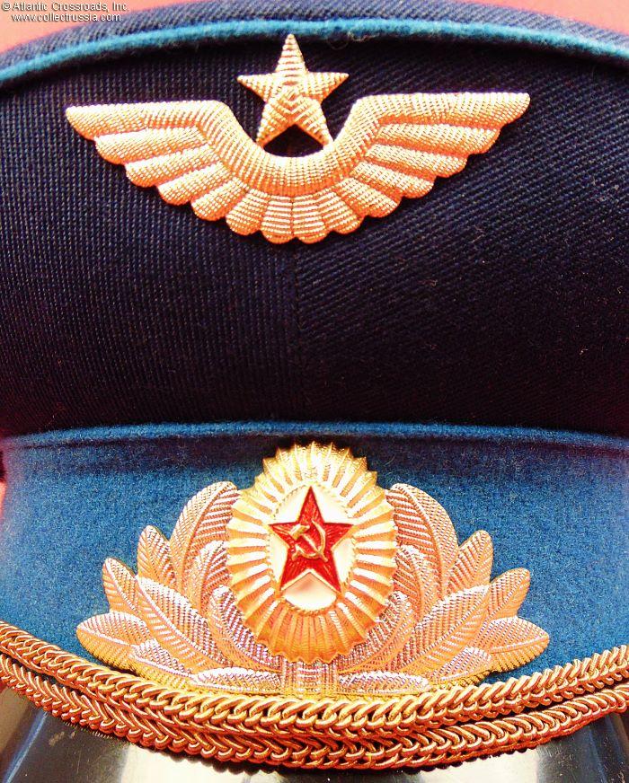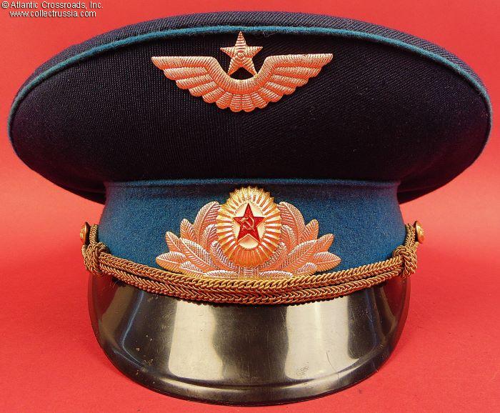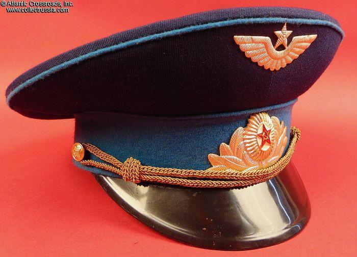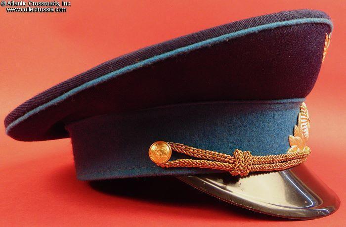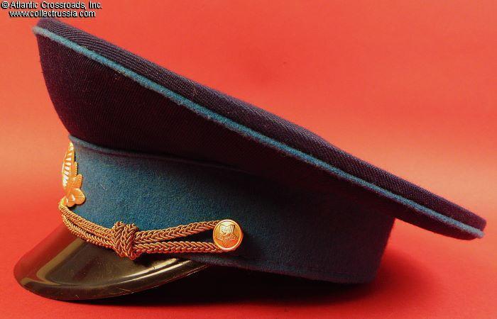 In navy blue wool gabardine, with sky blue piping and band, standard plastic visor. Original gold filigree chin cord is included. The sweat diamond of Moscow's TsEPK Factory of the Ministry of Defense shows a 1985 date of manufacture. There is a factory quality control stamp to the underside of the sweat band. Marked Size 59 on the sweat diamond (approx. US 7 3/8 / Large).