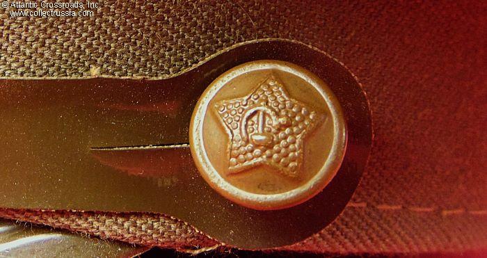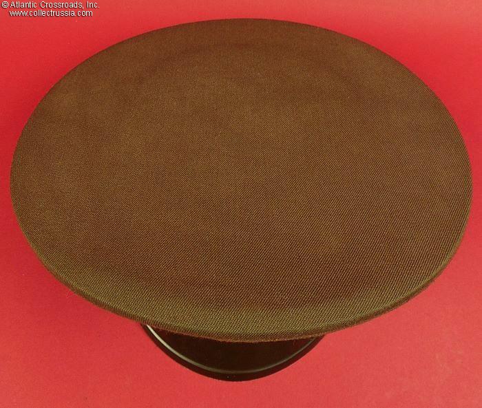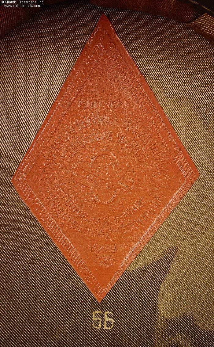 In olive drab wool blend twill, without piping. Subdued OD hat badge and matching side buttons in plastic. The sweat diamond shows the logo of the Kiev Headgear Factory and a 1987 date of manufacture. Size 56 (US 7 / Medium) is stamped in white on the liner. There is a factory quality control stamp to the underside of the sweat band.