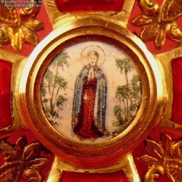 The depiction of St. Anne and foliage is very detailed as typical of the Eduard manufacture. The reverse shows maker mark "Eduard" under the enamel on the lower arm and Cyrillic mark ВД ("VD", the initials of Vera Dietwald, the widow and heiress of the origin