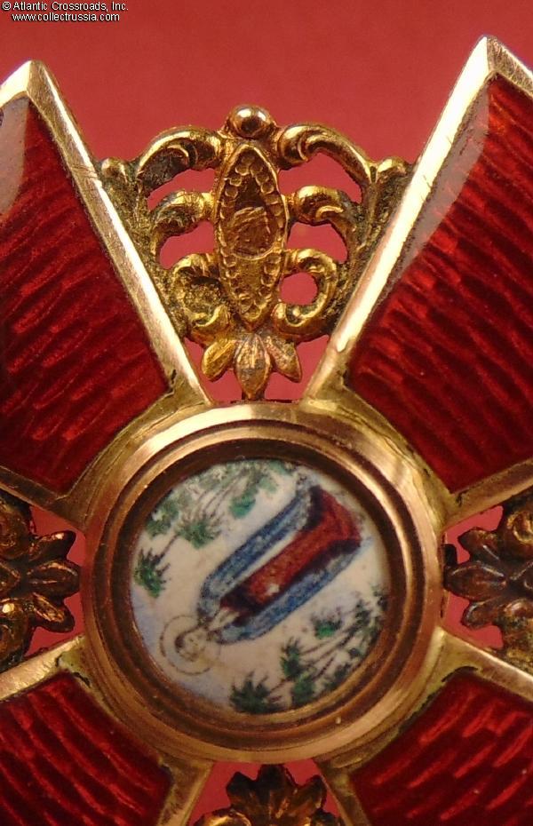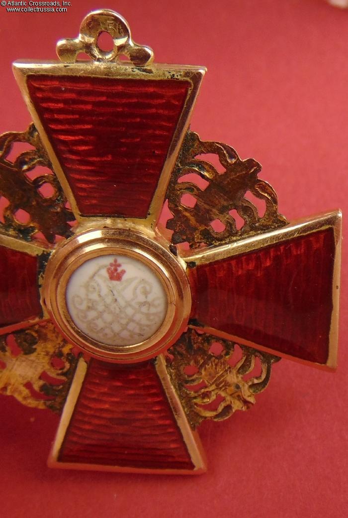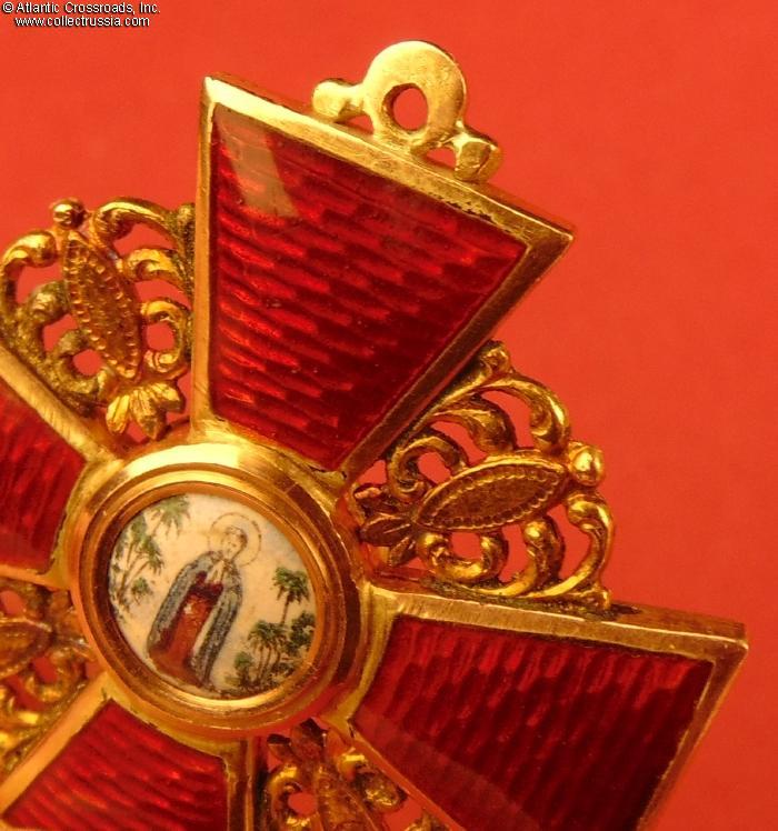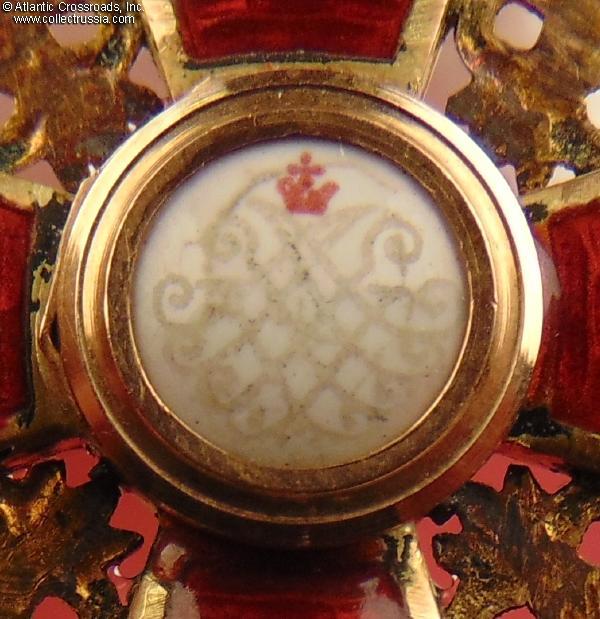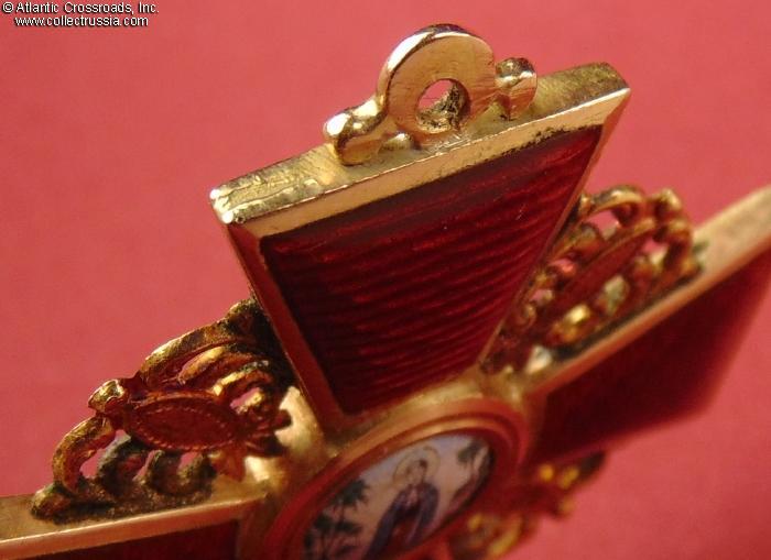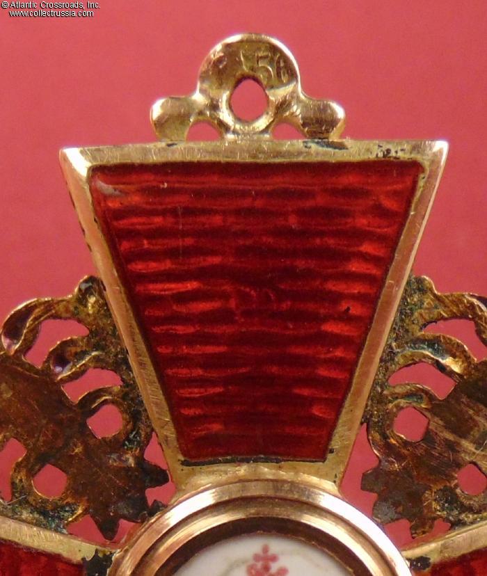The depiction of St. Anne and foliage is very detailed as typical of the Eduard manufacture. The reverse shows maker mark "Eduard" under the enamel on the lower arm and Cyrillic mark ВД ("VD", the initials of Vera Dietwald, the widow and heiress of the original owner of the firm) on the upper arm. The eyelet shows "56" gold hallmark with "Kokoshnik" (the latter is poorly struck and partly worn out but still discernable). Additionally, a very clearly struck "Kokoshnik" hallmark appears on the obverse of the golden ornament between the right and lower arms of the cross. Note the dot under the chin of the Kokoshnik-wearing lady, which designates the St. Petersburg assay inspection.