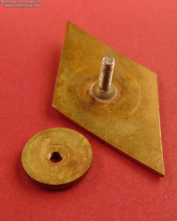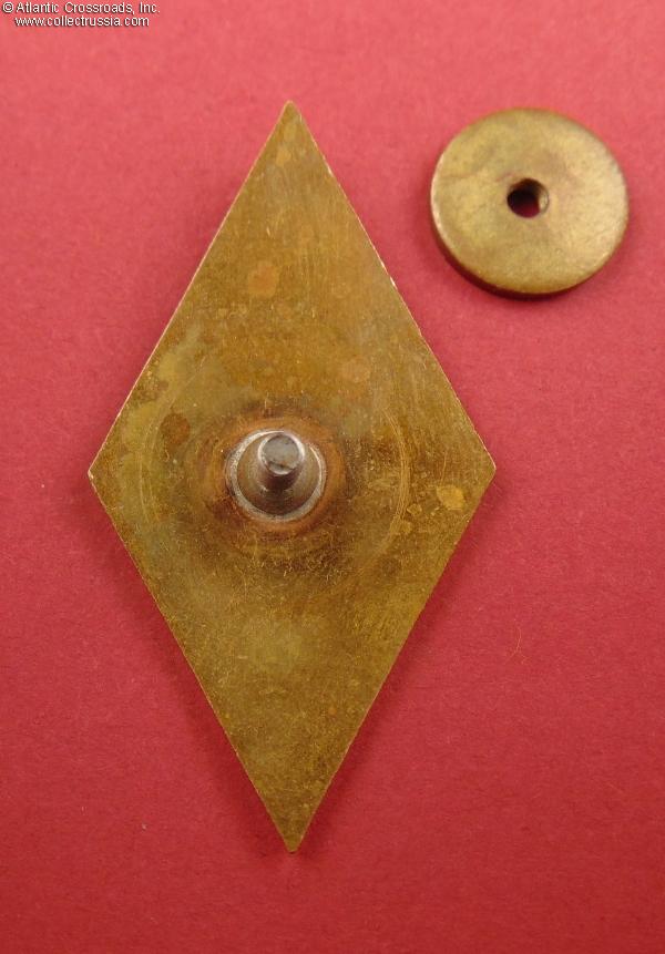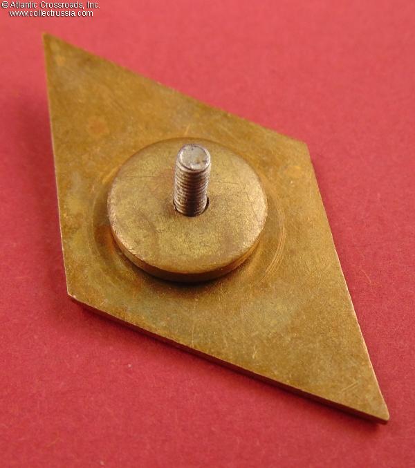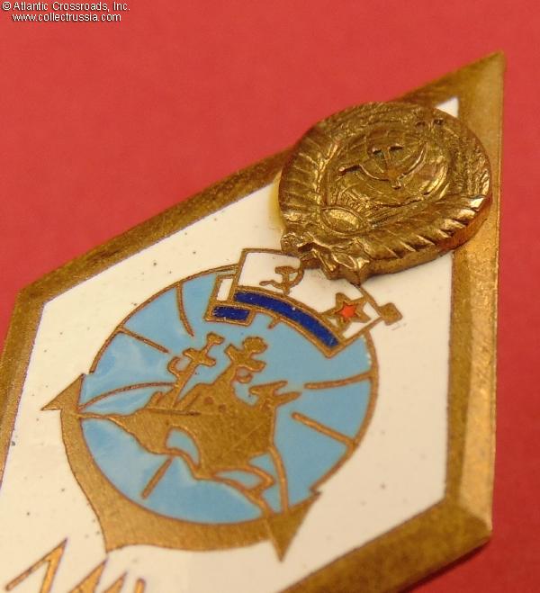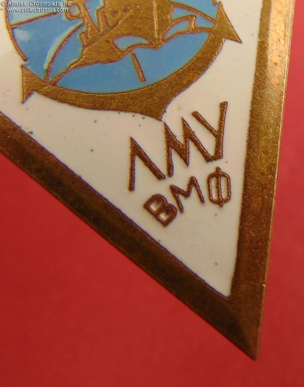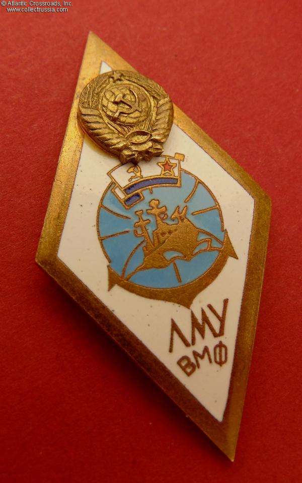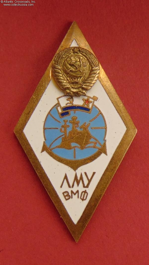 Brass, enamels; 49.4 x 26.9 mm. The state emblem at the top is a separate, superimposed piece. The inscription at the bottom is ЛМУ ВМФ (Russian acronym for Lomonosovskoe Morekhodnoe Uchilishche - i.e. Lomonosov Naval School of Maritime Navigation). Features a Soviet Naval ensign under the state emblem, an indication that this is a naval rather than merchant fleet school. This variation of the LMU VMF badge features white rather than blue background.