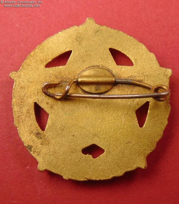Excellent condition. The enamel is perfect, having only a couple of microscopic contact marks and showing a beautiful luster. The gilt finish is intact and bright on both sides. The pin attachment is fully functional.