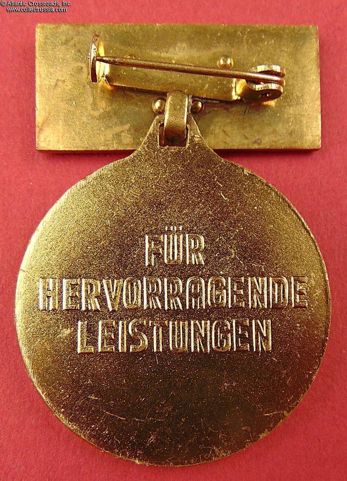In brass with gold-colored metal coating, measures 35 mm wide. The inscription on the obverse reads "Central Youth Center, FDJ Initiative, Berlin." The inscription in relief on the reverse reads "For Outstanding Achievements." The suspension has EHRENMEDAILLE ("Medal of Honor") under a layer of clear lacquer or resin.