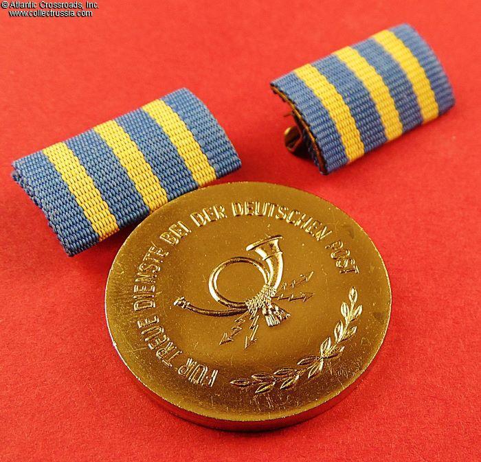 The Medal for Loyal Service in the German Post (original name "Treuedienstmedaille der Deutschen Post") was established on 13 October 1960 in five grades:10 years of service (bronze), 20 years of service (silver), 30 years of service (gold), 35 years of service (gold with honor clasp for women), and 40 years of service (gold with hono