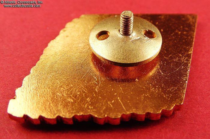 In brass, paints, and polyester resin, measuring 44 mm in height, 30 mm in width, with 8-mm screw post and original screw plate. The off-white tone of the midfield signifies that the badge was to be awarded to a Ministry of Internal Affairs officer graduated from University of German People's Police Karl Liebknecht, Berlin.