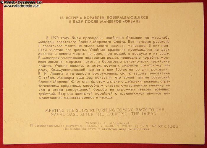 The size is continental standard 6" x 4", unmailable without a cover; published by the Visual Arts Publishing House, circulation 200,000. The postcard is #16 in a set showcasing the Soviet Navy ships. The annotation on the reverse is s brief informational about the naval exercise Okean which was conducted in commemoration of Lenin's centennial. The artwork is an artist's rendition of the scene of the ships' return; the artist's name, A. Babanovskiy, is printed at the bottom on the reverse.