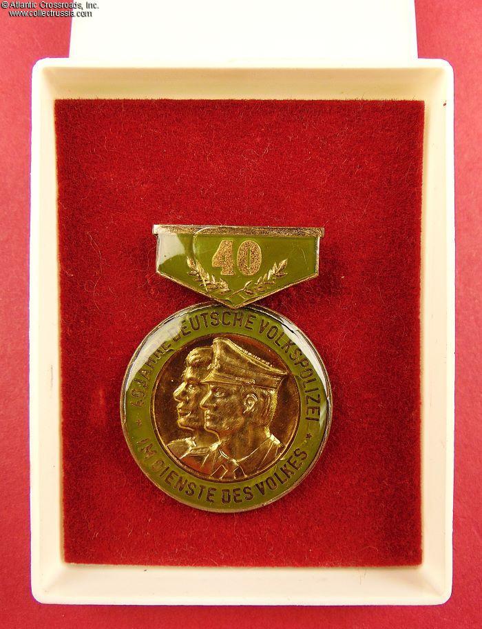 In brass, paint, and clear resin. The medallion is 33 mm wide. The inscription encircling the bas-relief in the center medallion reads "40th anniversary of the German People's Police. In Service to the People." The issue box is in plastic, with the fitted space on the bottom cut out of cardboard finished with ersatz short-nap velvet.