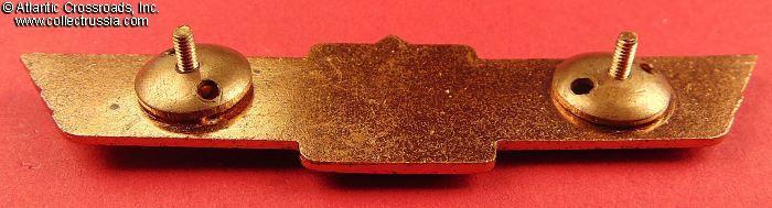 In brass and paint, 2-part construction with the fighter jet resembling the Soviet MIG-15 superimposed on the centerpiece. Two screwback attachments to the reverse.