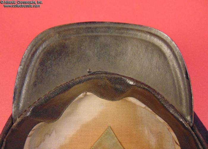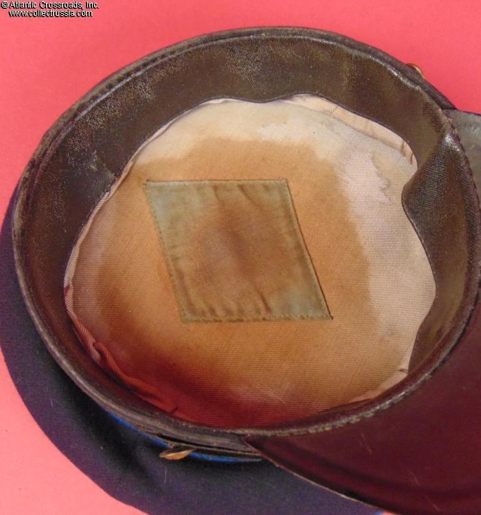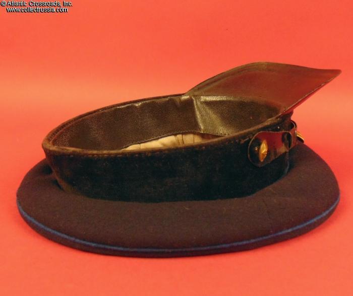 Very good to excellent condition. The crown and band are completely free of moth damage. There is a single spot on the underside of the crown near the right temple where a small piece of blue gabardine fabric is torn, but because it is covered by the overhanging part of the crown, it will be completely hidden from view when the hat is displayed by itself or on a mannequin head. The hat has kept its shape perfectly over the years; the visor is tightly attached and intact, not warped as is often the case. The exterior is perfectly clean. The liner, despite sweat staining, is generally well-preserved and free of excessive wear. The oilcloth sweat band is likewise in excellent shape.