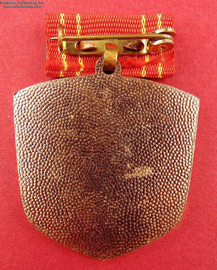 In brass and paint, measures 37 mm in height (incl. eyelet), 34 mm in width. The raised motto on the banner in the center medallion reads "Socialism Wins." The name of the medal in raised relief running along the edge of the obverse reads "For outstanding achievements in competition."
