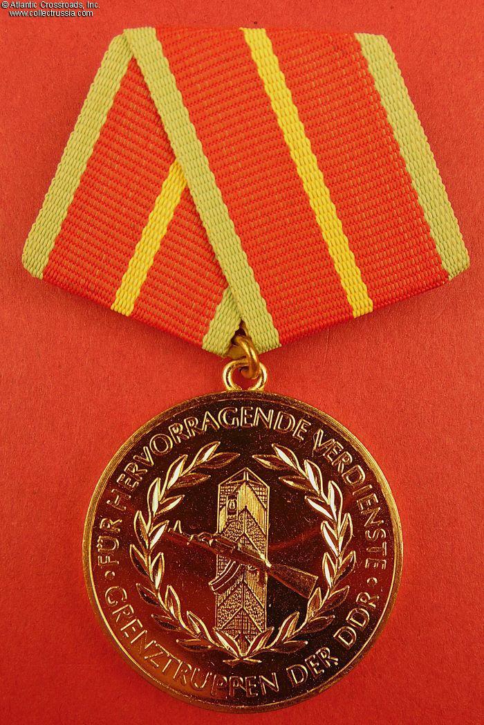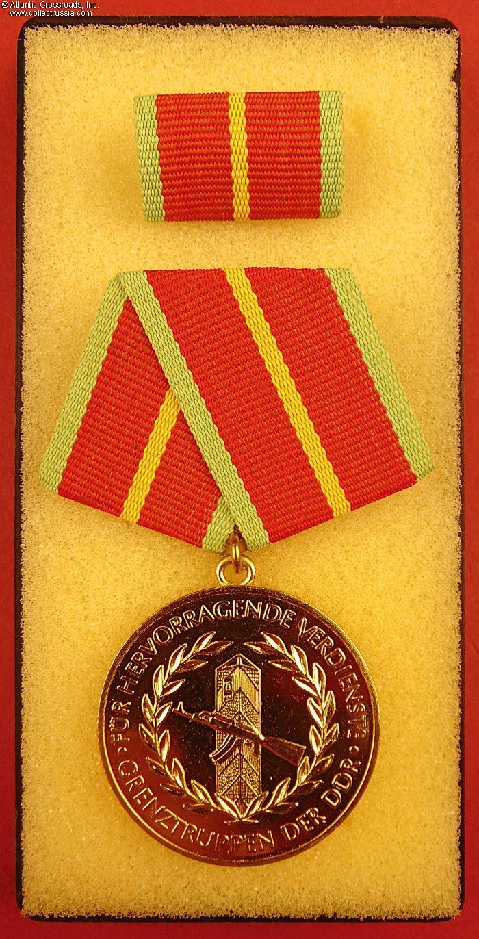 Brass gilt, measures 35 mm wide. The raised inscription encircling the obverse reads "For Outstanding Service in the Border Troops of the GDR". On the reverse, the inscription encircling the GDR state emblem reads "For Protection of the Workers' and Peasants' Power." The presentation case has black plastic bottom lined with light foam rubber inside, the lid is in Plexiglas.