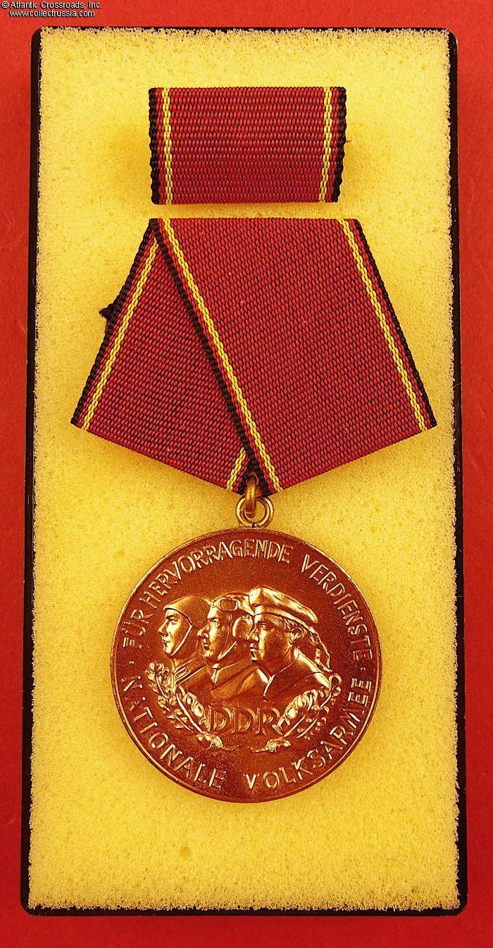 In brass, measures 35 mm wide. The raised inscription on the obverse, encircling the bas-reliefs of representatives of three branches of the NVA - Army, Air Force, and Navy, reads "For Outstanding Service in the National People's Army of the GDR." On the reverse, the inscription encircling the GDR state emblem reads "For Protection of the Workers' and Peasants' Power." The presentation case has black plastic bottom lined with light foam rubber inside, the lid is in Plexiglas.