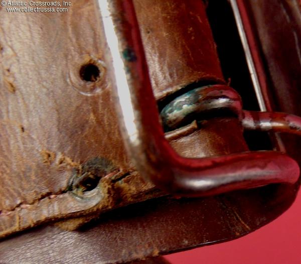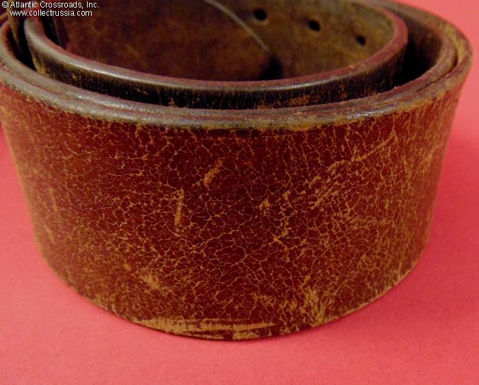 In very good condition. The leather shows a moderate wear and light scuffs from normal use, but remains sound, soft and attractive. There are no tears or stains. The nickel plating on the buckle is well preserved, having some tarnish but no underlying rust or pitting.