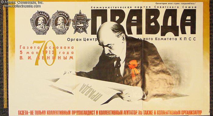 The lettering over the number 70 reads "The newspaper was founded on 5 May 1912 by V.I. Lenin." This is only partially true. PRAVDA was founded in 1908 by Trotsky in Vienna. The paper struggled and had a small circulation. On 5 May 1912, Lenin "founded" it again by starting to print it in St. Petersburg as the first legal daily workers' newspaper in Russia.