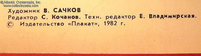 VERY LARGE format: when fully assembled, the poster measures 41 ½" x 77". Published by the PLAKAT ("Poster") Publishing House, Moscow, circulation 30,000, very small by Soviet standards. Printed on glossy paper. The artist's name, V. Sachkov, is printed in the lower left-hand corner of the poster. His hand signature is very faintly visible near the right-hand corner, written vertically. The phrase in red under the imagery is Lenin's quote about the importance of newsprint in communist propaganda. It reads "A newspaper is not only a collective propagandist and collective agitator, but also a collective organizer."