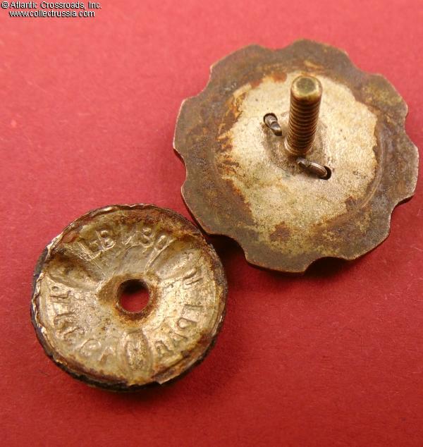Silver-plated brass and enamel, measures 21.7 mm in height x 21.2 mm in width; weighs 5.7 g without the screw plate. Two-piece construction, featuring a bas-relief portrait of Stalin superimposed on ared enameled "rosette".