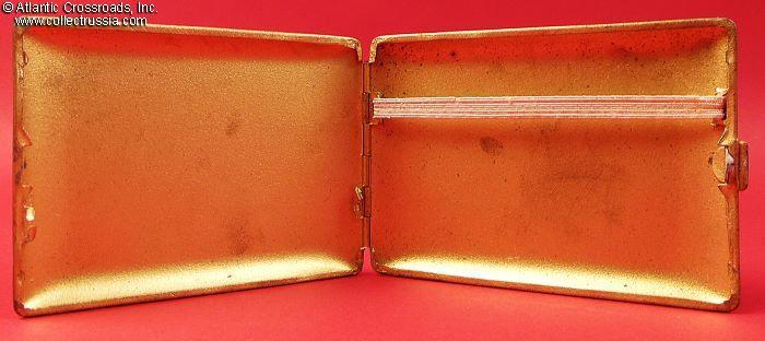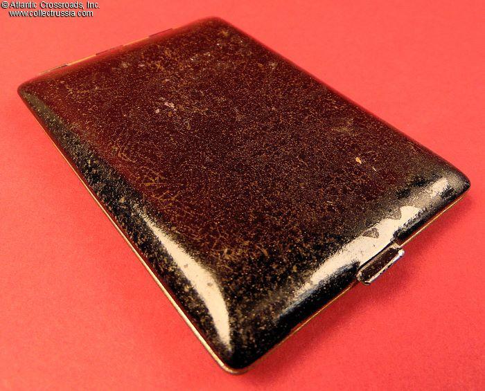 In very good overall condition. There are a few small pieces of enamel missing on the lid, somehow not too obvious on the figures of the dancers, and a couple of tiny chips / contact points toward the top edge. The bottom also has a couple of tiny pieces of enamel missing and some wear to the outer layer of the enamel - again, not too intrusive to the eye. Inside, there's just very mild pitting to the coating layer. The case is structurally sound, the halves match perfectly when closed, the latch is in good working order. Overall, the cigarette case presents quite well, and its uncommon green and black enamel will make it an interesting addition to a collection of Soviet tobacciana.