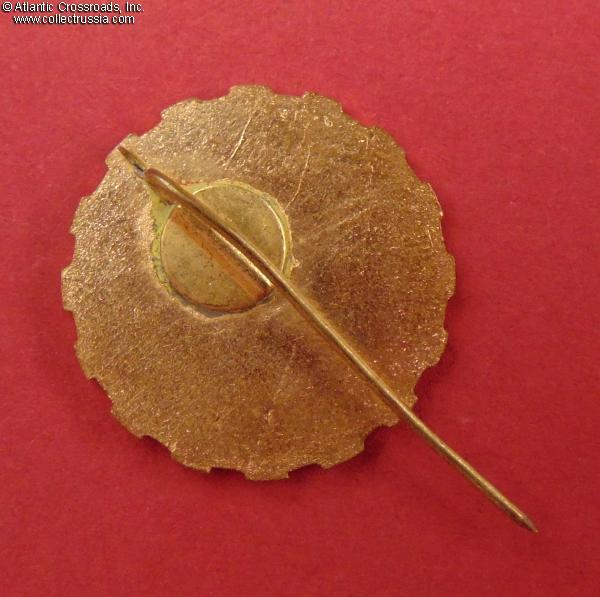 Gilded brass, enamels; measures 21.9 mm wide. The name of the college is inscribed along the edge in Russian and Latvian. The segmented artwork in the center symbolizes various areas of technical skills taught in the school. A very well-made and attractive piece in excellent condition.