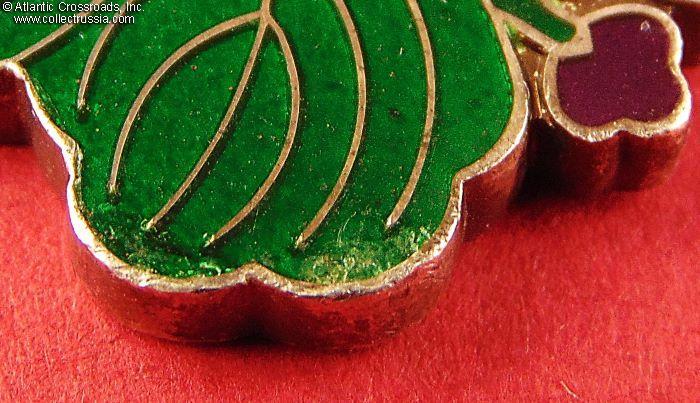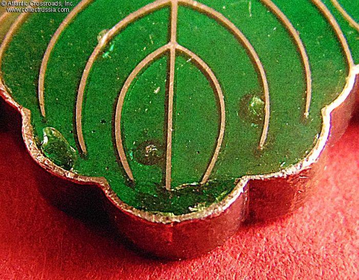 The badge is in very fine condition. The only wear somewhat visible to the naked eye are a few tiny chips and flakes to the green enamel near the edge. The ribbon shows mild wear and appears to be original; the metal hook and clasp on the ribbon are free of oxidation, and are affixed tightly.