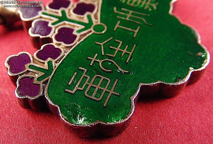 Silver and enamels, 33.7 mm in height (incl. eyelet), 31.4 mm in width. A paulownia crest, with the same 3+5+3 flowers as in the 6th class but larger than the ones used in higher classes of the order, is the entire badge. It is also veined on the obverse, and inscribed on the reverse with characters meaning "order of merit decoration". The crest is suspended from a jump ring connected to the suspension ribbon. The ribbon is in champagne-colored moiré silk with 5mm-wide red edges, less common than the regulation white with red edges.