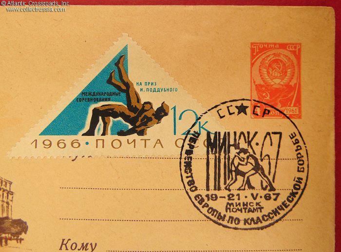 Government Postal Cover w. 1st Day Cover Stamp for 1967 European Wrestling Championship and a Commemorative Postal Stamp of a Different Wrestling Tournament!. 1967, EXC condition.