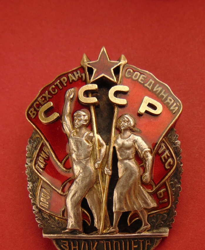 Order of the Badge of Honor, Type 4, Var. 1, #235968, c. mid-1960s. Relatively scarce early "Hollow Back" version featuring hand-engraved serial number w/o underline. The workers have less "child-like" proportions than on the earlier versions. In excellent condition and includes original steel suspension.