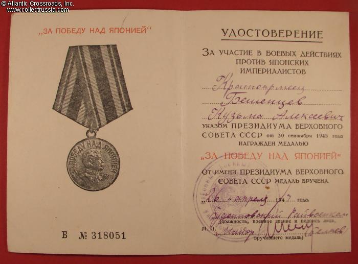Document for Victory over Japan Medal, issued on on 26 April 1947 to Private Kuz'ma Beshentsev.