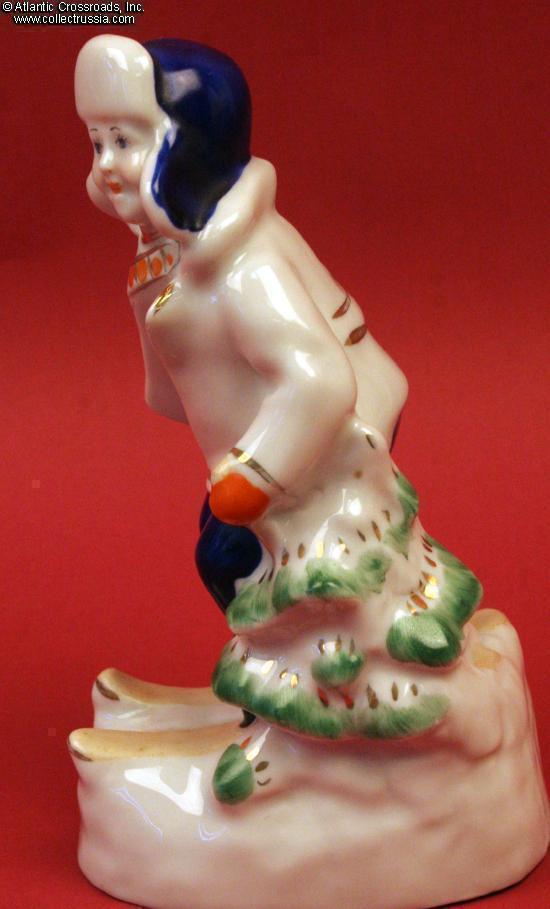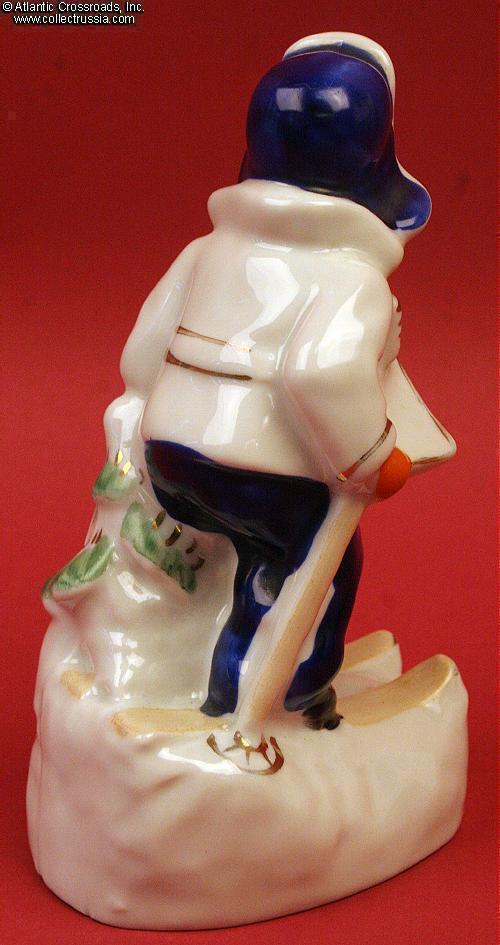 Boy on Skis, Polonnoe Porcelain Factory, 1951-54, porcelain figurine of a typical boy - skiing cross country in the cold weather with his jacket open and his cap unfastened.