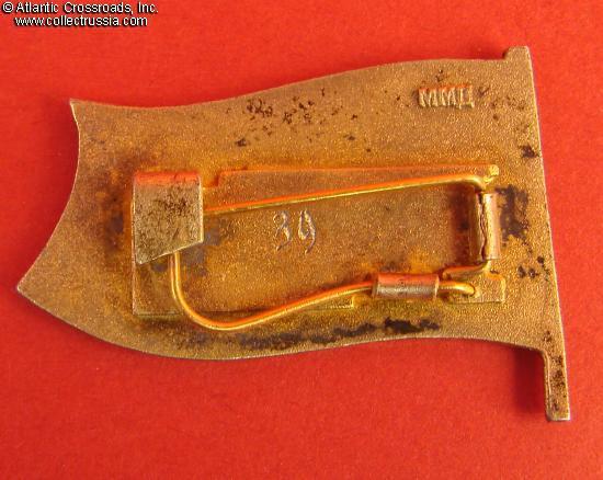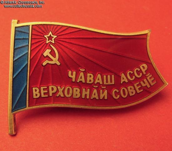 Silver gilt, enamels. measures 37.0 mm in width, the flagpole is 26.4 mm tall. Outstanding quality, typical of the Supreme Soviet badges. Engraved serial number "39" on the reverse and maker mark "MMD" with "square top" D. Badges with sharing these characteristics were issued to members of 4 Convocations of the Supreme Soviet of Chuvashskaya SSR: 1971, 1975, 1980 and 1985.