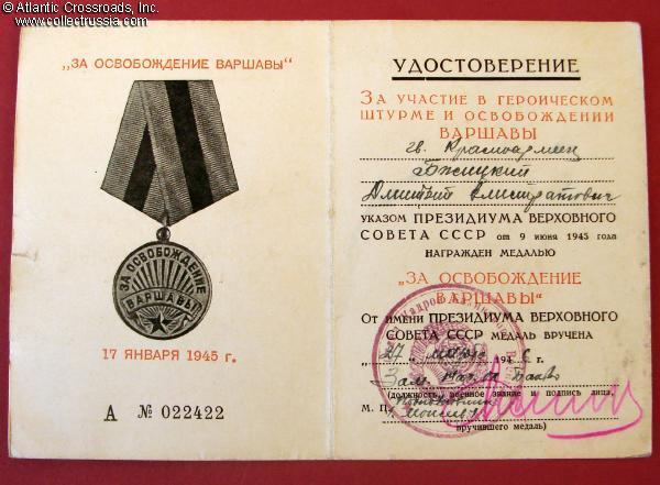 Document for a Liberation of Warsaw Medal, issued on 27 March 1946 to Guards Private Dmitriy Bzhitskiy.