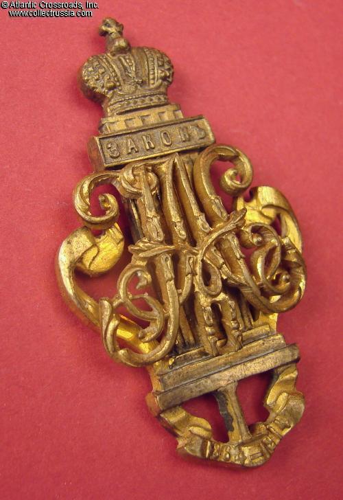 Nice quality badge featuring the Pillar of Law topped by Imperial crown, with superimposed ciphers of Alexander II and Nicholas II.