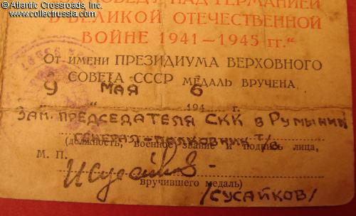 The document shows facsimile signature of Armored Corps Col. General Susaykov, Deputy Chairman of the SKK (Allied Control Committee) in Romania. There is a faint and illegible stamp, presumably of the committee. Interestingly, unlike the usual Soviet medal certificates, the document also shows the unit (apparently of the Romanian Army) next to the name: 36th Artillery Regiment. The name and rank of the recipient are hand-written in pencil in Romanian above the image of the medal. Note the date of issue, the first anniversary of the German surrender in WW2 (as celebrated in the Soviet Union.)