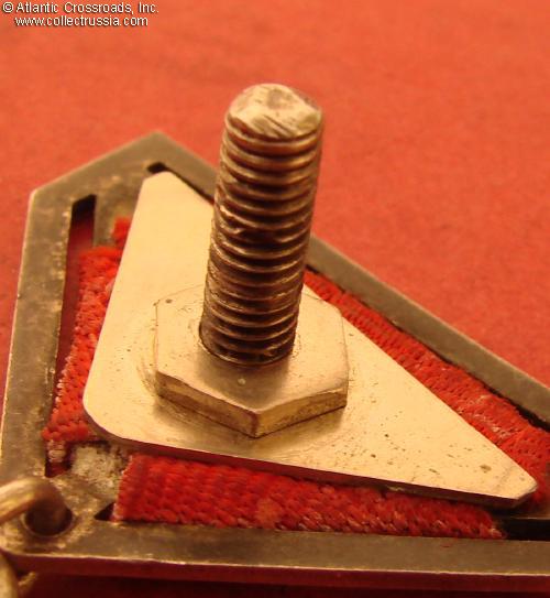 Silver, enamels; 36.0 mm wide. Cyrillic writing in two horizontal lines in the center, and one line along the top edge. Features stamped rather than hand-engraved serial number.