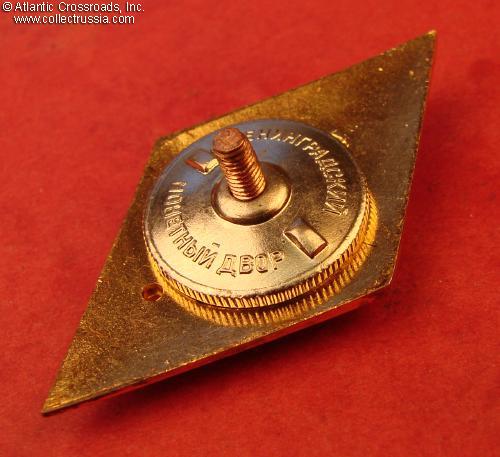 Gilded brass, enamels; 47.5 x 26.1 mm. Riveted 3-piece construction. Reverse shows raised logo of the Leningrad Mint. Fine quality.