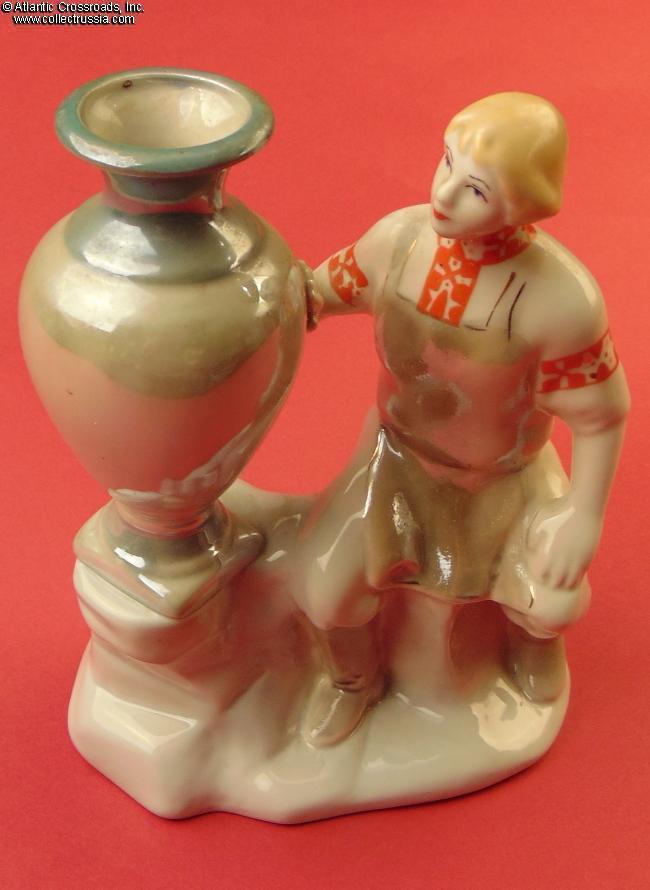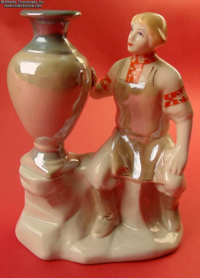Very impressive piece measuring approx. 8" (20 cm) tall, 6 ¼" x 3 ¼" at the base. This figurine is based on the P. Bazhov's fairytale Stone Flower. In excellent condition. The glaze, including the highly reflective mirror-like surfaces of the vase and workman's apron, is perfectly preserved and free of scuffs. This figurine can be a nice display centerpiece or, if desired, serve as a unique vase or possibly even a candlestick (with some necessary precautions so as not to damage the glaze).