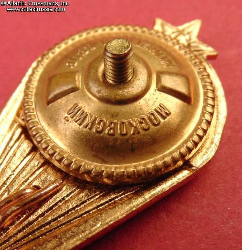 Brass, enamels; measures 47.3 mm in height not including the pendant, 21.7 mm in width. Shows late-style round Moscow mint logo on the reverse.