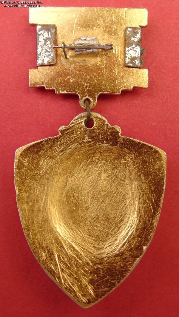 Aluminum, paint, lacquer; the pendant measures 43.8 x 34.4 mm. This is a very early version of the badge featuring the early style logo of the Pobeda Factory on the reverse of the suspension, a Cyrillic "P" in a hexagon. The reverse of the pendant is concaved, without a counter-relief, and shows characteristic "wrinkles".