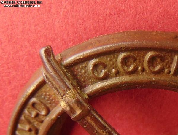 In copper, 43.0 mm tall (measured between the tips of the rifle butts and the upper edge of the band, 41.5 mm wide; weighs 9.4 g without the screw plate. An interesting early Red Army award awarded only briefly during the early to mid-1920s (there was also a 1927 version of this award which showed the year of issue).