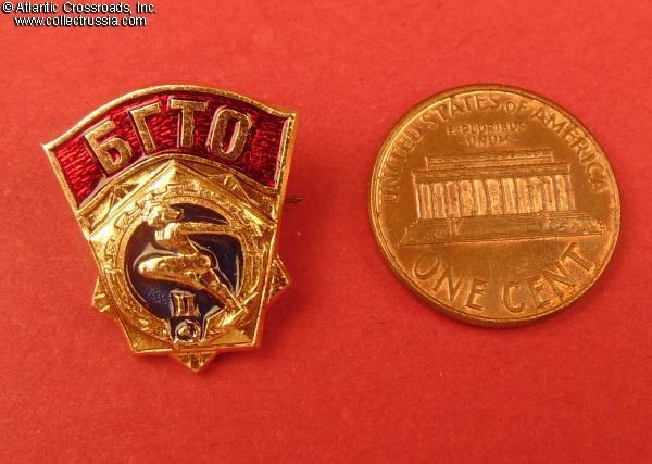 The badge is in anodized aluminum, paint and lacquer; measures approx. 21 x 19 mm. Features Roman numeral "II" for completing the requirements of the first (higher) level of the program - i.e. that for ages above 14. The reverse shows raised maker mark of the Moscow Experimental Advertisement Factory which produced many Soviet badges during the 1970s-80s period. In excellent condition.
