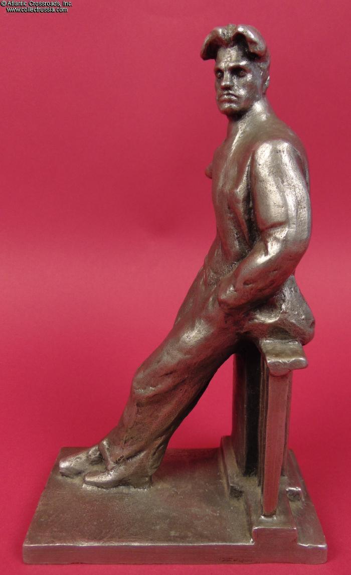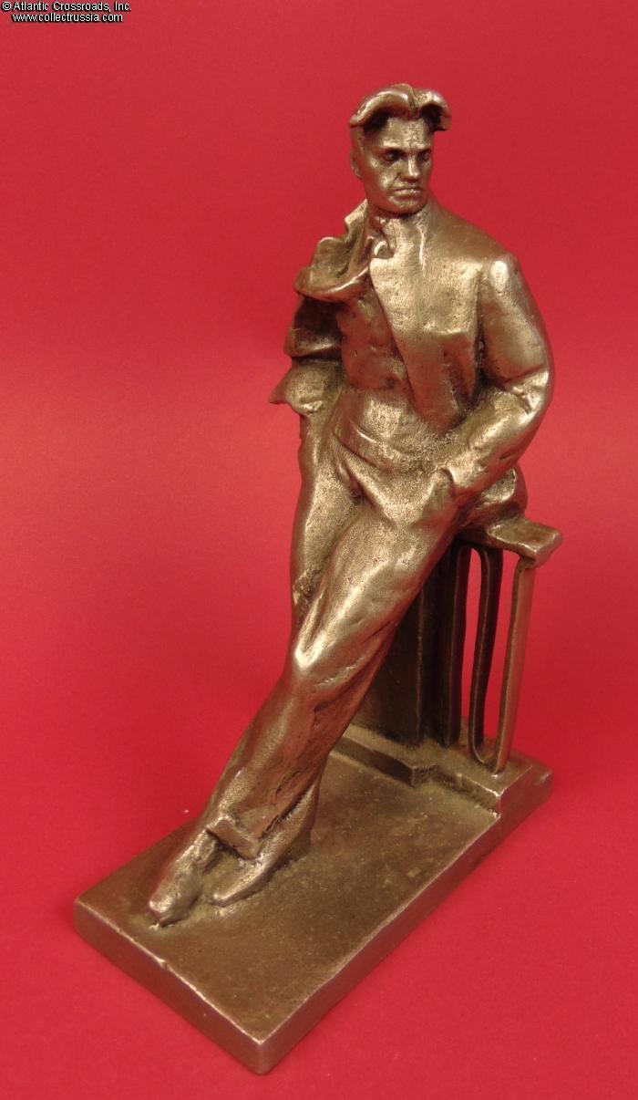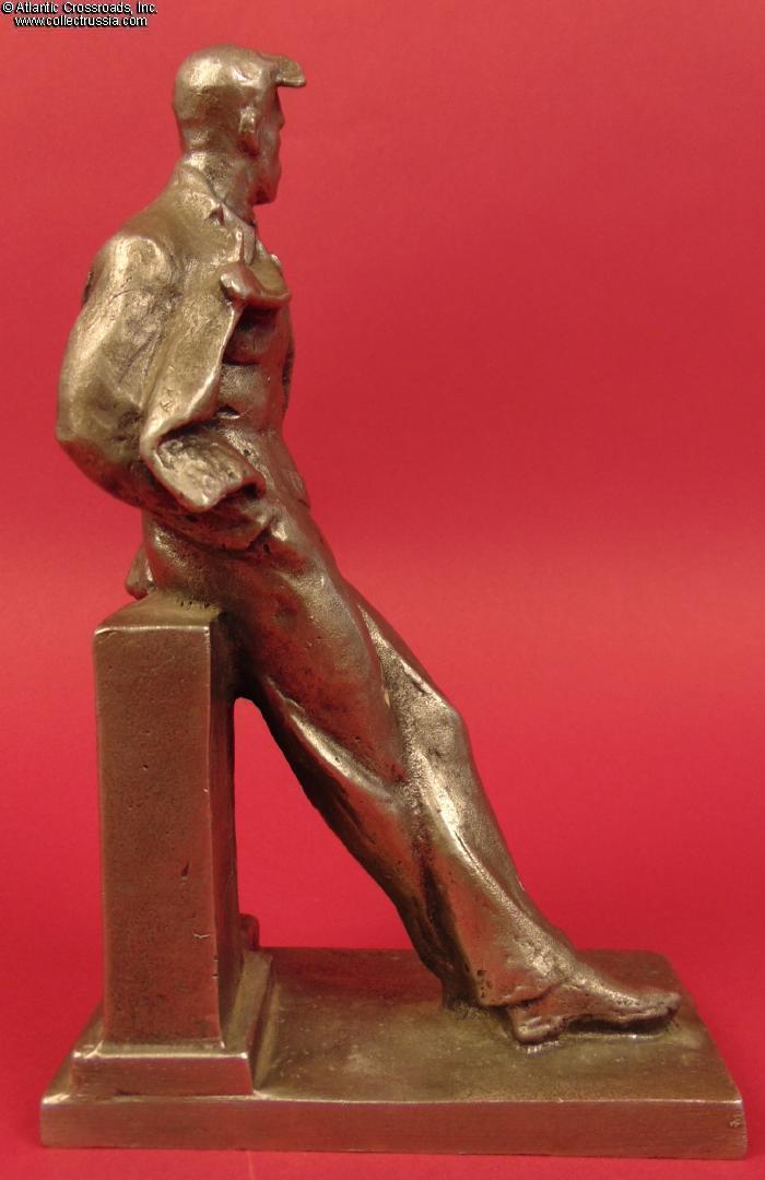 Large full standing statuette of Soviet Russian poet Vladimir Mayakovsky leaning on a balustrade, by sculptor Chebotarev, in solid Silumin, circa 1970s.